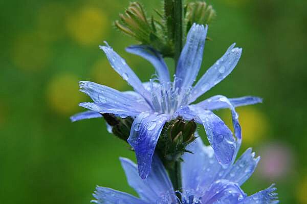 K modré a zelené jsem potřeboval do pozadí nějakou teplejší barvu. Na kraji cesty k jednomu venkovskému hřbitovu jich rostlo dost v příjemné společnosti žlutě kvetoucích jestřábníků zedních (lesních). Drobně pršelo, ale čekankám to na kráse nic neubralo, spíš naopak. V dešti získala modř jejich květů sytější odstín, hezky ladila s kapkami vody a k tomu krásně měkké světlo zatažené oblohy. Barvy a světlo miluji.