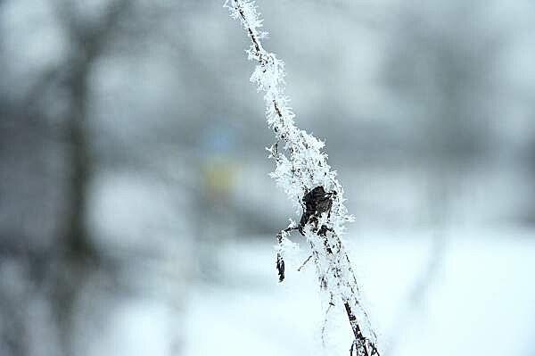 V černobílé krajině jsem maně marně hledal ještě nějaké jiné barvy, nu což, vzal jsem za vděk i žlutomodrou skvrnou. Žluť patří cykloznačce a modř za ojíněnou kopřivou je zákazová značka pro motoristy.