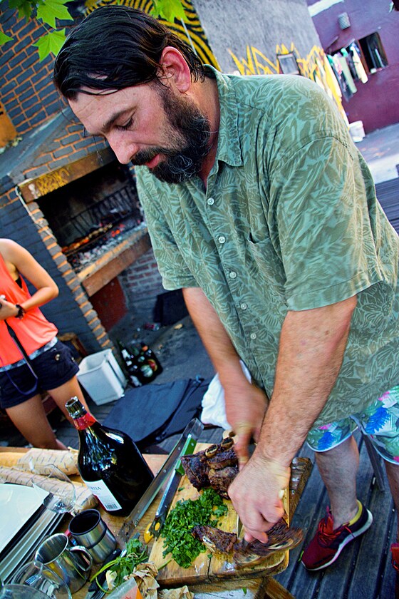Vracíme se do hostelu, kde se Kuba hlásí o naplnění včerejšího slibu – zašít gatě. Tak si hraju na švadlenu, zatímco pánové – technici, testují náš nový solární panel, který jsme s sebou dostali od Michala. Z tak namáhavé práce všem vyhládne, takže s Luckou, Vojtou a Jackem vyrážíme do nedaleké restaurace na místní specialitu – Chibito (sendvič s masem). Dáváme si jednu porci na dvojici, aby nám zbylo v žaludku místo na Asado (pečené maso na grilu), které slíbil Josse. Máme s ním sraz ve 4 odpoledne před hostelem, že půjdeme na nákup.