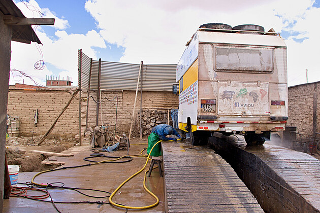 Franta s Žánem odchází shánět nové čidlo mazání a my se vrháme na úklid vnitřku Amálky. Všude je sůl, prach a špína a u topení stojí opřené ztvrdlé oblečení, ve kterém kluci leželi pod autem. I ivčina karimatka, která bývala kdysi měkká a zelená, a která už od La Junty slouží jako pracovní podložka, je bílá a tvrdá jako prkno. Vymeteno a vyklepáno máme přesně ve chvíli, kdy se kluci vrací, takže se můžeme přesunout do odsolovny. Amálka je z vnějšku doslova obalená ztuhlou solí, takže jak vypadá podvozek si radši ani nepředstavovat. Vojta našel nejbližší odsolovací stanici, ke které dojedeme, ale pán s obří tlakovou hadicí se při pohledu na rozměry našeho vozu uvolí pouze k tomu, že umyje právě podvozek. Ivča se proto jde přeptat na druhé místo, které má být hned za rohem.