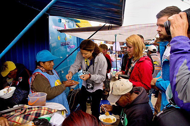 Projdeme kolem sušených lamích embrií (ta jsou údajně potracená, což jim na nechutnosti fakt neubírá a zakopávají se do základů domů pro štěstí), koláží ze třpytek a falešných peněz a jiných věcí připravených na současné oslavy až do jídelní části, kde máme 15 minut na to, abychom se nasnídali. Problém je, že během té čtvrt hodinky musíme stihnout obejít všechny stánky, zjistit, co kde mají, na co máme chuť a ještě to do sebe naládovat. A věřte mi, že hornická snídaně je hodně vydatná záležitost, žádné cereálie a mlíko, jako snídáme my. Rýže, těstoviny, brambory, pořádný kus masa, na co má kdo chuť. Nakonec všichni jdeme do stejného stánku na těstoviny s červenou omáčkou a na tenký, ale obří plátek masa. Ani kluci to nezvládají dojíst.