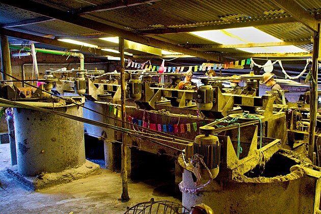 Autobus nás zaveze do továrny, kde ze surové rudy dostávají to, co potřebují. Všude v areálu jsou balonky a papírové ozdoby, ale chybí lidé. O svátcích se tu nepracuje. My se jdeme podívat do tovární haly, která je plná různých chemikálií a věcí, se kterými se asi žádný člověk nechce potkat moc z blízka.Sice bych vám tu ráda popsala nějak detailněji, jak a co tu dělají, ale pochopila jsem jen to, že se kamení z hory namele a pak se ta drť louhuje v různých chemikáliích, a že to je velmi primitivní až středověký způsob. I Vojta, který má s doly a podobnými věcmi zkušenosti, občas valil oči, jak je tohle vůbec možné v dnešní době provádět a ještě tu provádět turisty.