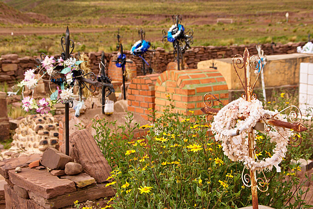 Žán totiž objevil defekt na jednom z kol, takže je potřeba jej vyměnit. V mezičase tak zavedu holky na fotogenický hřbitov. Náhrobky jsou ozdobené různobarevnými věnci. Na některých hrobech jsou modro černé, jinde bílo růžové a na některých hrobech leží misky plné popela. Vjedné se dají rozpoznat spálené sušenky. Asi tu pro své předky lidé pálí to, co měli na světě rádi, nebo nevím.