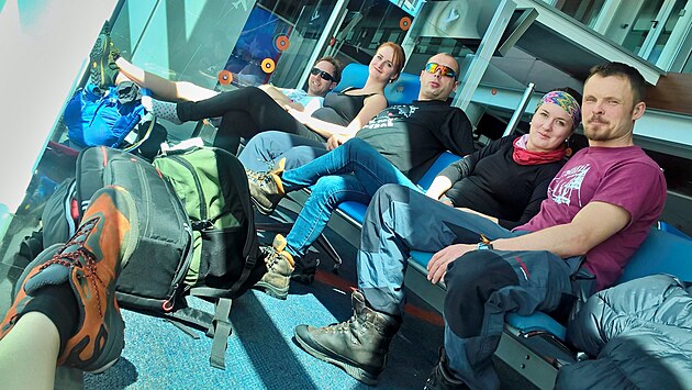 Provádíme úpravu zavazadel a čekáme na ostatní. Seznamujeme se s Vendy, která pro nás až do poslední chvíle byla paní Colombovou, tedy paní Honzovou, abych byla přesná. S Honzou a Ivčou se dneska vidíme po druhé, ale času na pořádné seznámení teď budeme mít víc, než dost a pravděpodobně i víc, než bude komukoliv z nás milé. Několikrát ještě dojdeme převážit zavazadla (asi jsem nechtěla vědět, kolik všechny ty moje krámy váží), až se konečně rozhodnme projít kontrolou. Stojí nás to jednu Kofolu, protože 2 litry v sedmi lidech vypít jde, čtyři už ne.