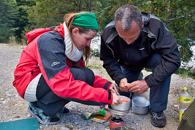 Když je Amálka zas o něco dokonalejší, pokračujeme v jízdě až na hezké parkoviště nad řekou Cisnes, na kterém se chystáme přespat. Je tu relativně klid, protože provoz na silnici není velký a Okoun vyskakuje snad už za jízdy a s prutem v zubech a mizí u vody. Nikdo mu moc nevěří, že by mohl cokoliv chytit, takže jdeme radši vařit. Dnes soutěžíme o nejlepšího „KašPárka“. Každá skupina volí jinou strategii, jak svým výtvorem zaujmout, ale ve výsledku je to pořád jen kaše a párek. My s Jackem čekáme na Okouna domluvenou hodinu, než se pustíme do vaření, a pak se s hotovou večeří vydáme podél řeky nasytit našeho lovce. Ten se ovšem v řece neustále pohybuje, takže ho nemůžeme najít. Nakonec se na večeři sám dostaví a přinese rybu!