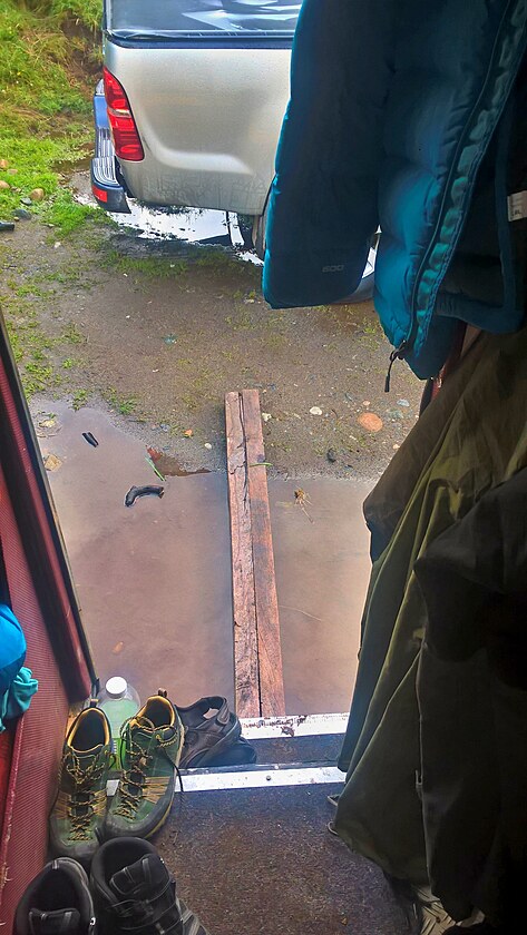 Po nějaké době se přiřítí všichni ostatní, trochu se poperou, kdo se bude kde převlékat, ale nakonec se nějak dohodneme, poskládáme do ležení a usínáme za vydatného bubnování deště. Jen chudák Vojta krom nejméně pohodlné postele ještě musí trpět to, že ho v noci několikrát přelézám, abych se dostala ven přes přední sedačky na záchod. Pod zadními dveřmi se nám totiž objevilo nepřekonatelné jezero. Vzbudí se asi jen dvakrát, pak už zvládne zaspat i to, že ho několikrát zasednu.