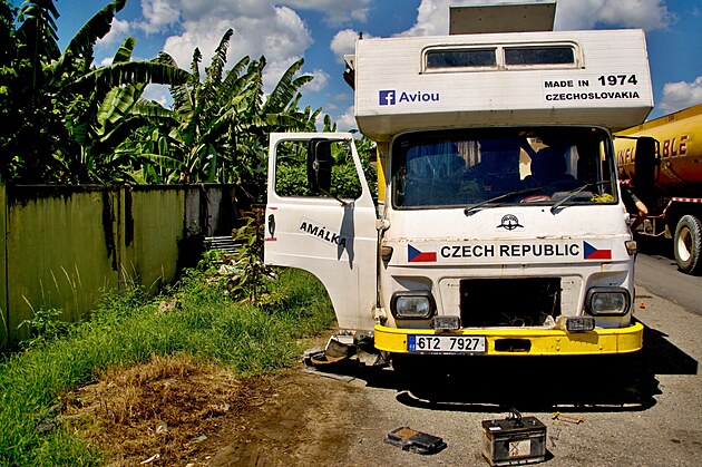 Přibližně vteřinu na to začneme cítit spáleninu. Automaticky saháme k vypínači od rádia, které se sem tam s podobným smradem zapne. Ale zrada, rádio je vypnuté. Ve stejnou chvíli vidíme i dým z pod palubní desky. Do prdele! Honza okamžitě odstavuje Amálku u krajnice a spolu s Okounem jdou hasit průser. Na definitivní opravy dojde až ráno za světla.