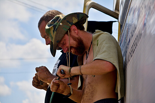 Venku před stanicí slyším, že pár kamionů začíná nervózně startovat, ale nezdá se, že by se kamkoliv hýbaly. I tak se radši rozeběhnu k Amálce. A najednou se celá řada aut dává do pohybu a my s nimi. Ve chvíli, kdy projíždíme přes násep, už se na něm tvoří velké louže. Předpokládáme, že s touhle rychlostí celý provizorní a týden budovaný přejezd tak hodinu po nás odnesla voda. Pro nás je ale důležité to, že jsme přejeli! Všichni slaví a chvíli to i vypadá, že tyto šťastné události zvládnou přehlušit všeobecnou nevraživost v posádce. Jedeme dál směrem na Viru, kde má být druhý stržený most.