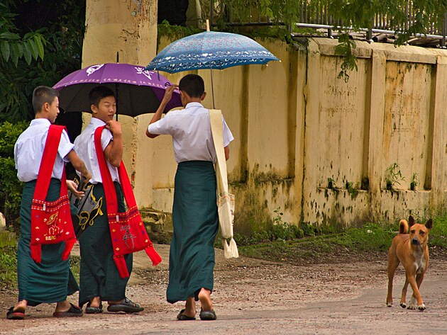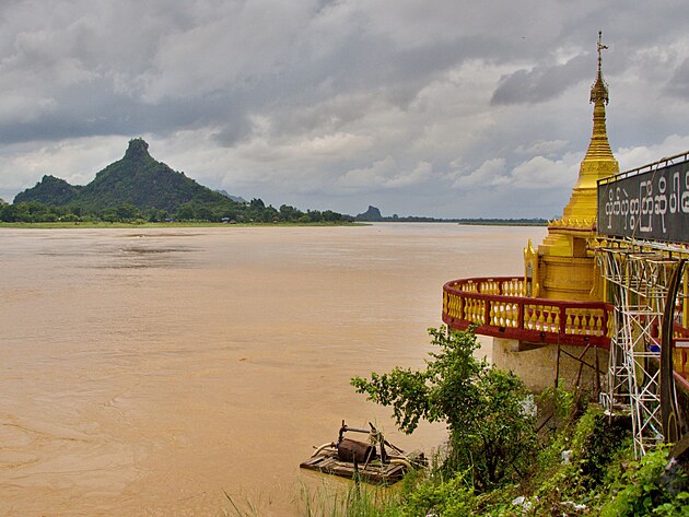 U chrámu Shweyinhmayaw je mimo jiné hezký výhled na řeku. Nejprve se procházím kolem, pozoruji malé vratké lodičky na vodě, které převáží jak pasažéry, tak náklad. Třeba obrovské pytle plné nějakého ovoce. Z lodě je přenáší bosí muži do aut. Nechápu, jak s takovým nákladem může někdo vůbec stát, natož v podstatě běhat.