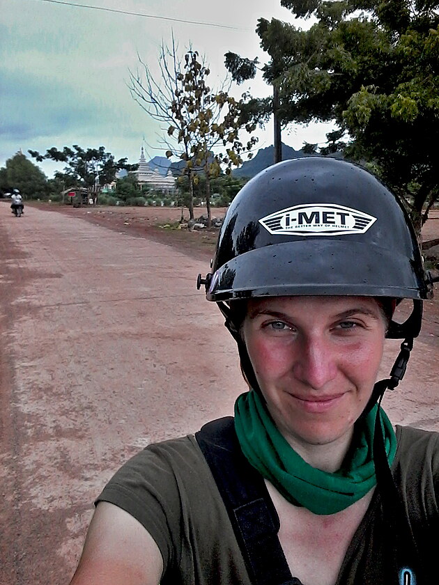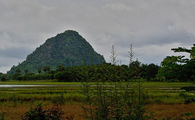Za městem jedu po docela široké silnici a kolem mě sviští auta, což mi trochu nahání hrůzu, ale musím si zvykat. Překvapivě se i zvládám kochat okolní krajinou, hlavně horou Zwegabin, která se tyčí do výšky 723 metrů. Pokud se Vám to zdá málo, tak v místní ploché krajině je to fakt velehora. Na ní stojí buddhistický klášter, kam se ještě nedávno dalo dojít a dokonce přespat, ale před pár dny tam spáchal sebevraždu nějaký kluk z Francie, takže mniši řekli dost. Chápu.