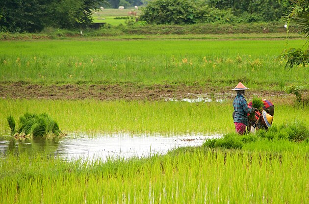 Cesta z města už vede po staré silnici, která je „trochu rozbitá“, prostě tankodrom bez krajnice s hlubokými dírami. Ale lemují ji krásná rýžová políčka. Což je zároveň důvod, proč dneska nezastavuji a nefotím, pravděpodobně bych totiž při pokusu o zastavení zahučela i s kolem do vody v rýžovišti. Musím uznat, že tato etapa nebyla uplně dělaná pro nezkušeného cyklistu.
