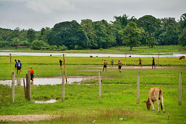 Nacházím správnou odbočku a zastavuji se u jedné louky. Pár kluků tam hraje zápas ve vodním fotbalu. Pokud tento sport neznáte, tak si představte normální fotbal, u kterého ale hráči běhají bosí a po kolena ve vodě.
