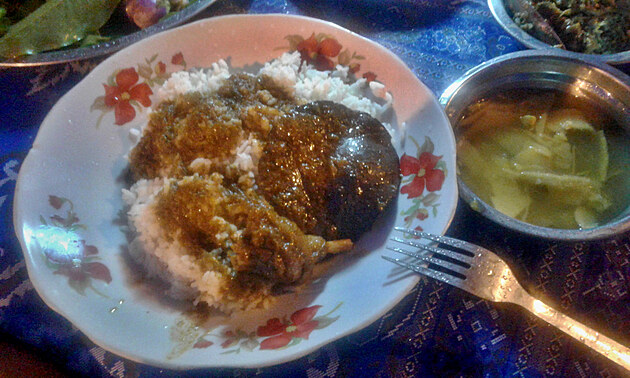Při této činnosti dojdu k závěru, že mám hlad. Loučím se s blešárnou a přejíždím kousek dál po ulici, kde je restaurace, kterou jsem objevila večer, když jsem se vracela domů. Je docela plná, všichni tu sedí s čajem a jídlem. Dávám si Myanmarský čaj (černý, kořeněný s kondenzovaným mlékem) a ptám se po něčem sladkém na jídlo. Dostanu chleba ve vajíčku politý máslem s krystalovým cukrem. Je to překvapivě moc dobré.
