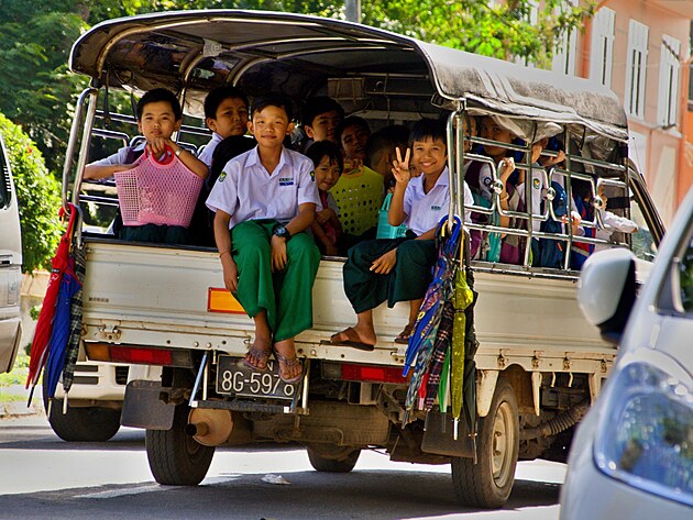 Jedu kolem velké školy, ze které zrovna děti odjíždí hromadně hijety domů. Musím říct, že se mi líbí místní školní uniformy. Zelené longyi (něco jako zavinovací sukně u mužů i žen), bílé košile a holky mašle ve vlasech. Vypadá to, že barvu mají podle toho do jaké třídy patří. Já jsem uchvácená jimi, oni zase mnou. Takže si máváme, smějeme se na sebe, pár holek rovnou pózuje, že chtějí vyfotit,na rozdíl od klučiny, který je do té doby bavil, a který se ke mně otáčí zády.