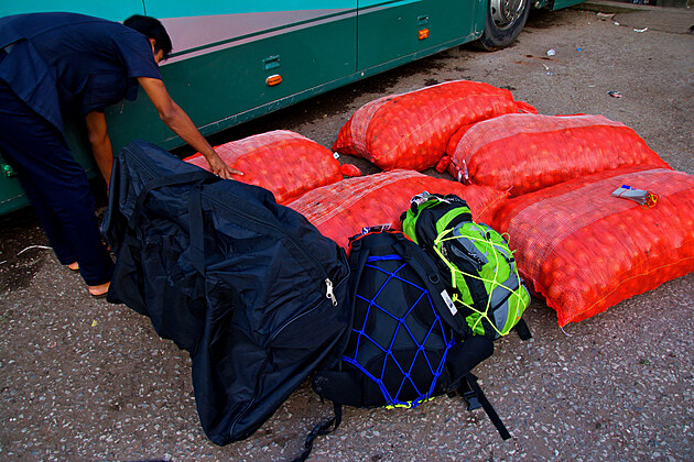 Pak se konečně začne něco dít. Řidič začne nakládat zavazadla. Prosím ho, aby tašku s kolem dal někam na vrch, protože vidím několik pytlů snad s tunou cibule a brambor. Řidič kýve, že jasně, chápe. Radši mu ještě jednou ukazuju vnitřek tašky, že to je sice těžké, ale křehké. Zase kýve. Tak fajn. Ještě dostanu tři lístečky s číslem, abych si v cílové stanici vyzvedla svoje věci a jsme vyzváni, abychom si nastoupili na svá místa, takže mi kolo zmizí z dohledu. Tak snad dojede.