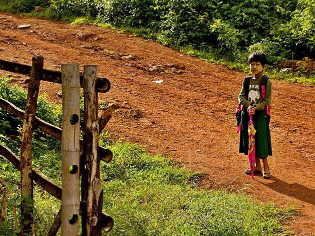Starší dcera majitele krámku se mezi tím, co se my balíme, chystá do školy a její malá sestřička v princeznovských šatičkách dohlíží na to, jak se vypravuje. Moc se jí nikam nechce, radši by zůstala s námi a česala Willovi culíčky. Ale tatínek, který připojuje baterii k solárům, aby se přes den dobila, jí vrazí do rukou deštník a už jí žene nahoru do kopce za vesnici do školy.