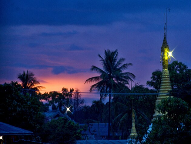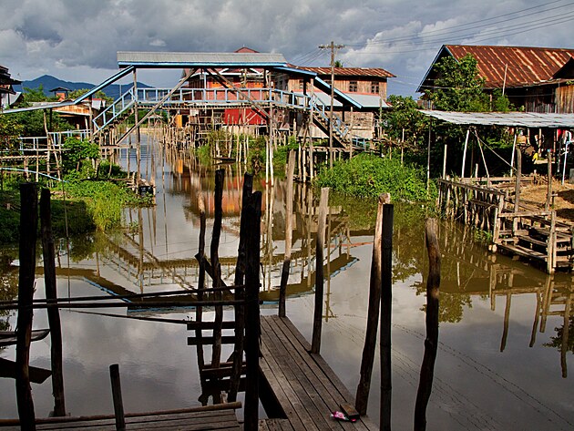 Míříme k jezernímu hoelu, který si zamluvily holky, a kde je na mole je čeká uvítací výbor, který jim hraje na místní tradiční hudební nástroje. Moc hezké. Loučíme se, máváme a jedeme dál. Další zastávka je až v Niaungshwe, kde máme zamluvené hotely my ostatní. Najíždíme tak na hlavní trasu přes jezero. Strašně rychle se zatáhne, začne foukat šílený vítr a spustí se pořádný déšť. No bezva…