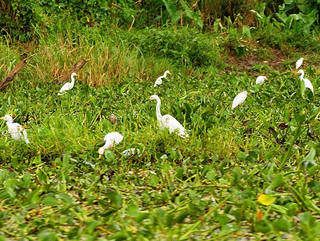 Kus od města už se zase jezero začíná zužovat do zarostlého kanálu. Tady je plno volavek a taky naplaveného bordelu. Proplouváme kolem prvních domů města, voda je špinavá, blátivá, plná odpadků. Ale i tak málem přejedeme koupající se děti.