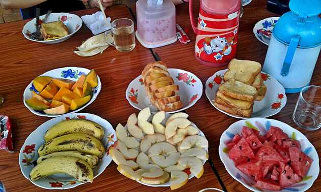 Naše snídaně je moc dobrá. Chleba ve vajíčku a ovoce.