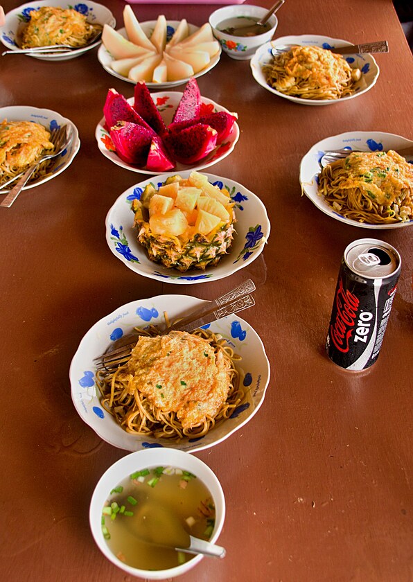 V 1 jsme dle plánu v restauraci, kde budeme mít poslední společný oběd. Nudle, vajíčková omeleta, ovoce.