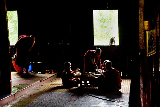 Budíček v 5:30, brrrr. Malí mniši už si chystají v chrámu společnou snídani, zatímco my se balíme, abychom se vrátili na snídani se zbytkem naší skupiny.