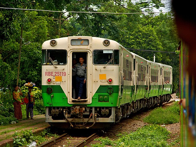 Vracím se zas na most, ze kterého vedou schody na nástupiště. V jejich polovině sedí chlapík u psacího stolu, ale ani on neprodává ty správné jízdenky. Ty totiž mají až v budce přímo na nástupišti. Kupuju si lístek za směšnou cenu 200 Kyatu a čekám, až přijede ten správný vlak. Dočkám se asi za 20 minut. Je to taková malá lokálka, jede krokem, takže by se do ní dalo nastupovat i za jízdy, což také mnozí činí.
