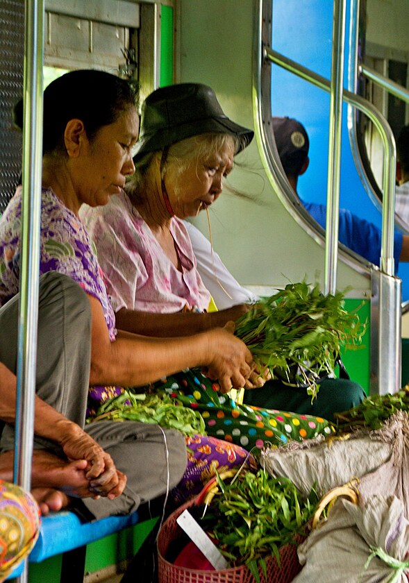 Nacházím si místo na lavici pod oknem, které má rozbitou roletu, ale tím správným způsobem – nejde zavřít. Takže mám skvělý výhled, ale zároveň na mě prší. Prvních pár minut mám neodbitný pocit, že to nemůžu 3 hdiny vydržet. Že na nejbližší zastávce vystoupím a vrátím se do hostelu. Ale víte co? Nevystoupím. Je tu super. Střídavě pozoruji dění uvnitř, kde se neustále obměňují lidé, přistupují i vystupují cestující, ale i obchodníci se vším možným, sedí tu paní, které vážou svazky bylinek, obchodníci, kteří tahají obří pytle plné bohové vědí čeho, a když je potřebují v zastávce vyložit, prostě je začnou házet ven, jakmile začne perón a sami vyskakuj až na jeho úplném konci. K tomu se postupně mění i město, které objíždíme. Vyjeli jsme z Down Townu na sever, nejdrřív v dálce vidím moderní výškové budovy, pak se domy snižují, přecházejí z cihlových na chatrče z bambusu a přibývá špína. A nad vším tím se snad ze všech míst dá zahlédnout minimálně jedna zlatá pagoda.