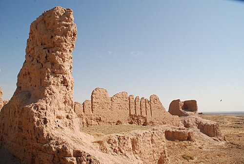 V 7 tu máme auta, která nás za 50$ na vůz budou skoro celý den vozit po pevnostech v okolí. Tradičně se rozesazujeme a vyjíždíme. U Urgenche zastavuje naše auto na benzínce, kde je před vjezdem taková jakože vrátnice a dva stánky s občerstvením a u toho musí všichni z aut vystoupit a čekat. Druhý auto stojí u krajnice o kus dál a čekaj na nás. Pak můžeme pokračovat dál, Pavel Marvina a mě seznamuje s historickými skutečnostmi a poté následuje botanická přednáška o kytce Asa Foetida (též zvaná Ďáblovo lejno), co vypadá jako zakrslej suchej stromeček. Ať se Pavel snaží sebevíc, Marvin to stejně zazdí tim, že to je miřík, takže mrkev. Další zastávku děláme až těsně pod pevností Ayaz – qala, abychom si jí mohli vyfotit zespoda a taky abychom z blízka prozkoumali tu „mrkev“.