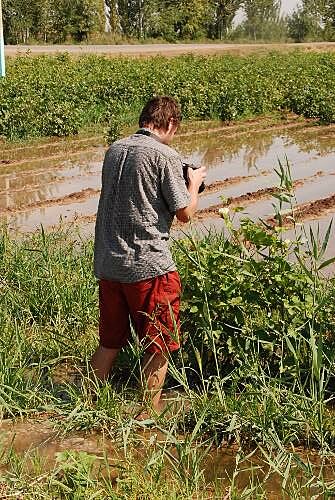 Pavel si nechá zastavit u pole s bavlnou, odvážně zouvá boty a brodě se po kolena ve s.... no budem tomu radši řikat voda, jde fotit. My s delšími objektivy si vystačíme se stáním na posledním milimetru suchého kousku země. Když se dostatečně fotograficky vyjádříme, můžem pokračovat.