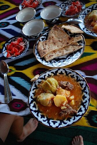 A to byla naše poslední oficiální zastávka. Nicméně další řidič udělá u prodejce melounů. Chvíle rozmýšlení a domlouvání a jdeme si taky pro jeden. Řidič jej ochotně vybere a jedem dál. U mostu naše druhý auto zdrží policejní kontrola kamionu před nima, takže na ně zkoušíme chvíli čekat, ale když to začne vypadat na moc dlouho, jedem dál, zastavíme u stánku s vodou, koupíme nové zásoby, abychom neumřeli než dojedem, najedeme na další most (nově postavený), ze kterého můžeme vidět starý most končící ve vodě. Pak už jen znova na benzínku s výstupem venku a na autobusový nádraží vyzvednout lístky na bus do Buchary. Nakonec místo toho, abychom je koupili jen přijde ta včerejší paní se zlatým (doslova) úsměvem, prohlásí, že si nás bude pamatovat a pokud tu budeme v sobotu dost dopředu, tak pro nás to místo v autobusu bude.