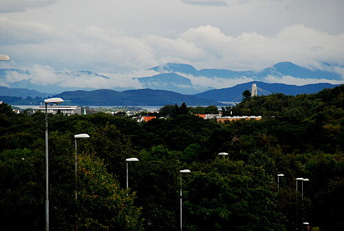 Nacházim cyklostezku, na které je směrovka na centrum, take se na ní přesunu a jdu. Kolem baptistickýho kostela, pastvin s krávama a hlavně nahoře na kopci, ze kterýho je krásnej výhled na Stavanger v údolí a na záchranářskej vrtulník, co přistává někam do centra.