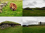 Domů jedeme jinou cestou, kousek odsud je totiž Vikingská vesnice. Tam zastavujeme a jdeme si jí projít. Za polozemními kamennými domy se střechou porostlou trávou se tyčí obrovský moderní bytovky. Zajmavej kontrast, se kterym si tu nikdo asi moc neláme hlavu. A do toho se tu pase stádo ovcí, který nás netečně pozorujou, když mezi nima procházíme k domku, kterej je přístupnej i z vnitřku. Tady je expozice starého Vikingského bydlení. Ohniště, postele s kožešinama... V dalším domě bydlej v půlce ovce a ve zbytku je ukázka living history. Paní Vikingová tu za tučnou finanční odměnu učí lidi rozdělávat oheň pazourkem, což si čistě z finančních důvodů necham ujít a jdeme radši ven. Tam vidíme Vikinga vylézajícího z plechové budky, tak se s ním Janni zapovídá, zatímco já si vyběhnu nahoru na kopec od kama by měl být dobrý výhled a trochu mě překvapí, že jsem téměř na stejnym místě, kde sem byla včera, když jsem zabloudila.