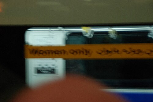 Ukáže na nápisy na oknech vagónu.. Women only! A opravdu, v celém vagónu jsou jen ženy, od malých děvčat po stařenky. Zbytek vlaku je obojetný.