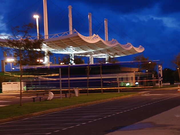 Poslední čůrpauza na Evrpském kontinentu se uskuteční u Eurotunel shoping center. Venku pomalu začíná svítat, takže do Británie už dorazíme evidentně za světla. V obchodním centru protáhnu nohy procházkou mezi zavřenými obchody, pokusím se o jednu rádoby uměleckou fotku autobusu a nápisu Bon voyage a povede se mi jiná ve chvíli, kdy chci vyfotit jenom domeček celnice, no tak už to chodí.
