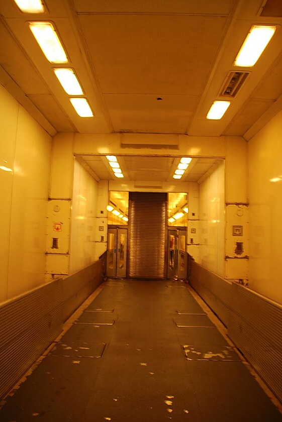 Mlčenlivost prolomena (škoda, že až tak dlouho), autobus zastaven ve vlaku. Stevardka nás upozorní, kde e ve vlaku smíme pohybovat, kde najdeme sociální zařízení, a že cesta bude trvat cca 35 minut. Vedlesedící si stěžuje, že mu z toho podmořského cestování zaléhají uši. Poznámky, zda je pro něj rýmička smrtelná choroba si odpustím,polituji jej a jdu se projít ven. Nejdřív kolem odstavených autobusů a velkých aut k poslednímu vagónu, kde si odskočím a zároveň z okýnka ve dveřích vyfotím náš vjezd do tunelu. Poté si dojdu pro knížku do autobusu, kde je s vypnutou klimatizací vedro na padnutí, takže si radši sednu na zvýšený chodníček podél stěny vlaku a čtu si. Za půl hodiny jsme na Anglické straně, takže návrat do žlutého pekla pro pokračování v cestě.
