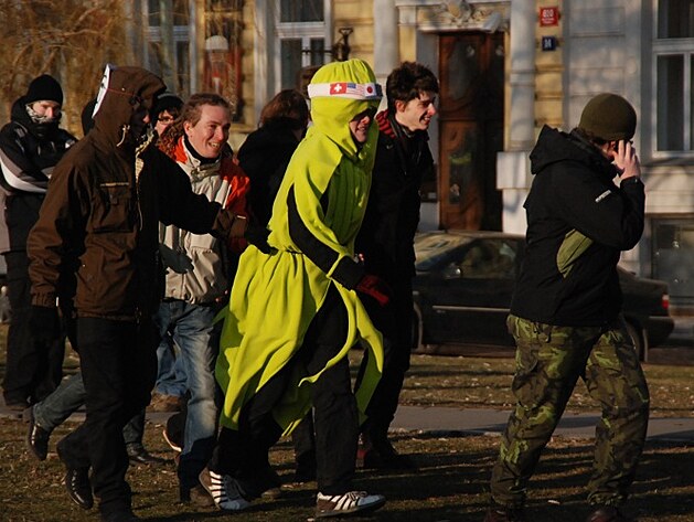 Řadíme se do dlouhého průvodu čítajícího několik tisíc osob a vycházíme. Pár příliš aktivních jedinců jde špatně, ale jsou zpacifikováni organizátory a umravněni na správnou trasu. Cestu provází skandování hesel. Mezi oblíbené patří STOP ACTA, Nechceme cenzuru, ACTA je zlo...