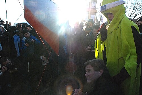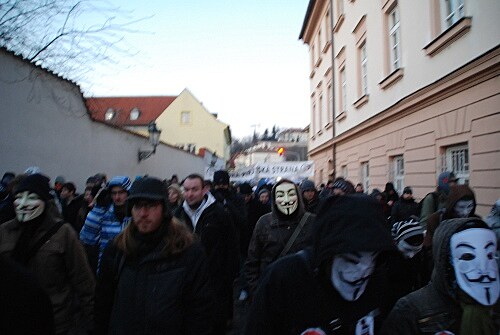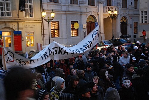 2. února už to bylo poněkud jiné, informací jsem měla poměrně dost, a když se ještě ozval Pavel, abych tentokrát šla a to i s transparentem, už jsem moc dlouho neváhala. (Pravda, když jsem si představila své ubohé zmrzlé ruce, říkala jsem si, že nějaké to písemné vyjadřování názoru bych s radostí zanechala doma, ale zase sem ho v tom nechtěla nechat samotného.) To, že si vezmeme pirátské klobouky, jsem odsouhlasila hned. Vzhledem k tomu, že hodně lidí dávalo najevo své sympatie s Anonymous nošením jejich masek, my jsme dávali zas najevo, že patříme na stranu hlavního svolavatele.