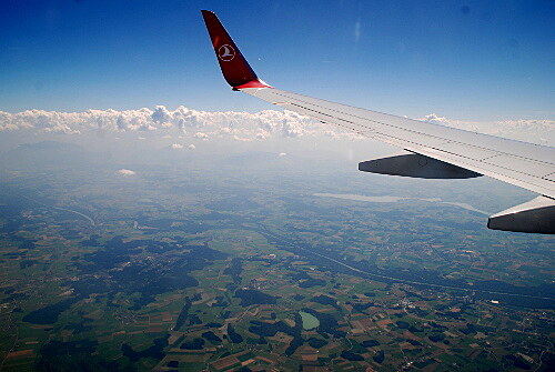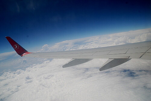 Letadlo se naplní do posledního místa. Dívám se ven z okna, zatím jedeme pomalu k runwayi. Loučím se se svojí Tyrkysovou zemí a přemýšlím, jestli je to naposled nebo ne. (V té chvíli, co jsem odlétala jsem o tom byla poměrně skálopevně přesvědčená, ale teď už si tím zas tak jistá nejsem.) Odlétáme na čas a cesta je příjemná a pohodová. Část jí zaspím, pak letušky donesou jídlo – špenátový šáteček, rozmáčený toustový chleba a mochomůrky, teda vlastně žampiony. Jsem ráda, že jsem se nasnídala na letišti a oběd si vezu v kabelce.