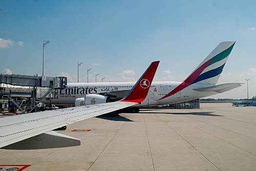 Pasová kontrola na výstupu ze země už je poměrně rychlá („Iran good?“ „Iran good.“) a už mi tedy nezbývá, než najít gatu č. 13, která je ovšem nadepsaná pro let Pegasusem do nějaký uplně jiný destinace. Prý si mam sednout, že pak zahlásí z kama poletí to správný letadlo. Fajn. Za chvíli to skutečně hlásají, ale pouze persky, takže naštěstí pomůže nějaké slečna, co je sice Íránka, ale už od mala žije v Německu a mluví i anglicky. Společně s ní sejdeme dolů k autobusu, kam se nasardinkujeme, jí uloví nějaký pán, co si chce povídat a já si jdu udělat pár fotek letadel. Konečně jsem tu totiž za denního světla.