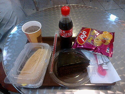 Sbíram si všechny svoje věci a hrnu se do odletové haly. Tam trochu umravním zavazadla do lépe přenositelné formy , ale k definitivnímu přebalování se ještě neuchyluju, na to jsem tu příliš brzo. Díky levnějšímu taxíku, než jsem čekala, mám ještě 300 000, které nemám moc jak využít. Vyměnit zpátky nejdou, protože to je moc málo peněz a suvenýry tu žádný nenakoupim, protože tu nic takovýho nemaj. Fajn, takže snídaně. Zajdu do restaurace, že bych si třeba dala nějaké pořádné jídlo, ale nakonec vyhodnotím, že na smažený kuře a hranolky v 5 ráno vážně nemam stavěnej žaludek, takže se přestěhuju vedle do kavárny. Vyberu si ten největší čokoládovej dort, co tam mají a k němu horkou čokoládu. 80 000. Tak ještě sendvič, abych měla svačinu do Istanbulu. 80 000. Tak k tomu ještě pití. „To je vlastně v ceně. A k tomu ještě brambůrky.“ Super. Tak těch zbylých 140 000 holt utratím ještě jinde. Pouštím se do likvidace toho nejlepšího čokoládového dortu, co jsem kdy jedla a té asi nejodpornější horké čokolády, co jsem kdy pila, která asi prožere dno kelímku, takže mi skoro půl litru lepivý hmoty skončí na sukni a batohách. Takže sem sem přiletěla politá jahodama, zpátky čkokoládou. Jinak bych to snad ani nebyla já.