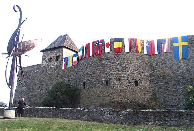 Vstup do hradu zdobily vlajky zemí, jejichž kováři se zúčastnili setkání.