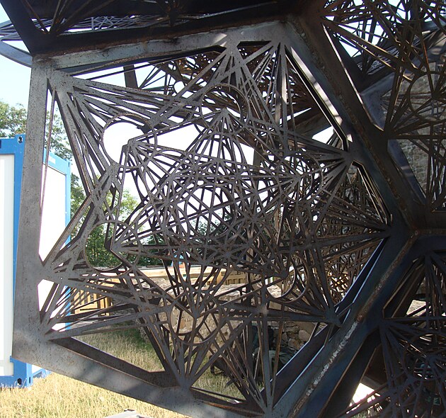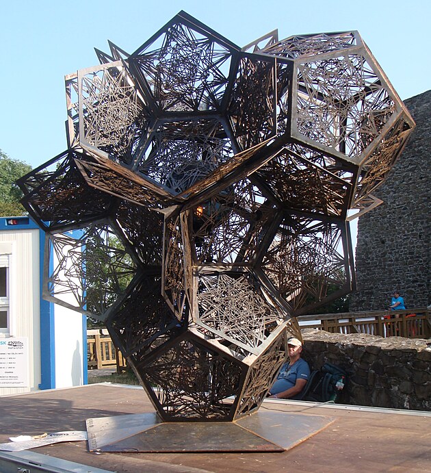 Ještě před vstupem do hradu Helfštýna byla umístěna monumentální plastika Jana Dostála s názvem Metatron star. Je vidět, že je svařena z většího počtu stejných pětiúhelníků, které byly vyřezány z plechu tloušťky asi 4 mm nejspíše laserovým hořákem. Na internetu jsem si vyhledal, že Metatron je v judaismu jméno anděla, který se často symbolizuje šesticípou hvězdou s podobnou sítí čar uvnitř.
