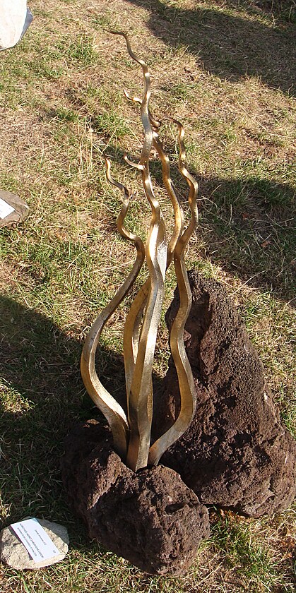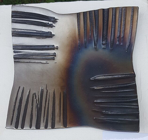 Následující plastika Hořící keř je vykovaná z nerezu a zabarvená ohřevem na teplotu okolo 300 °C. Při ohřevu na teploty 200 až 300 °C se na běžné i nerez oceli tvoří barevná vrstva oxidů, někdy se tento postup nazývá napouštění.