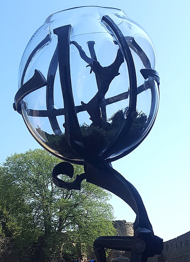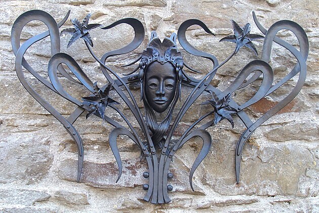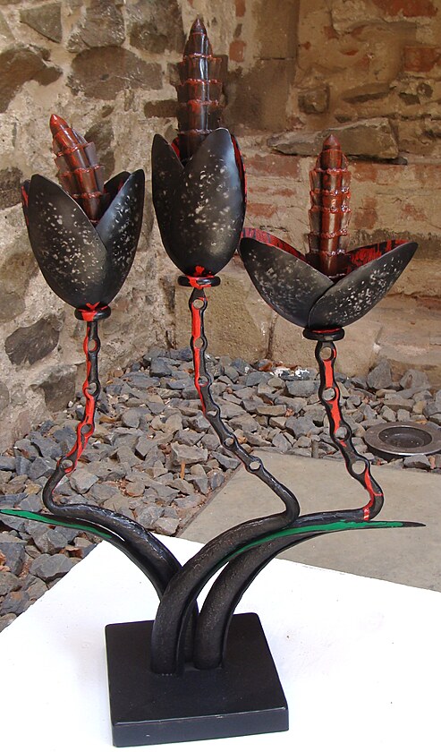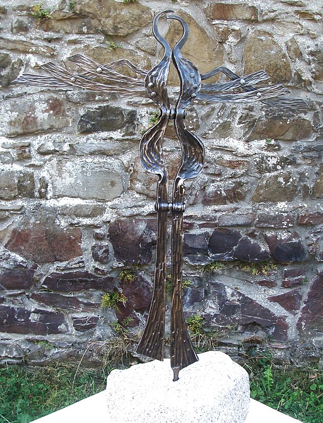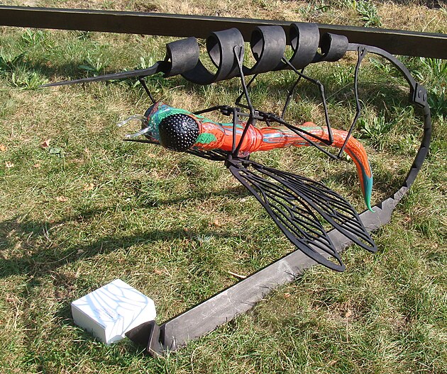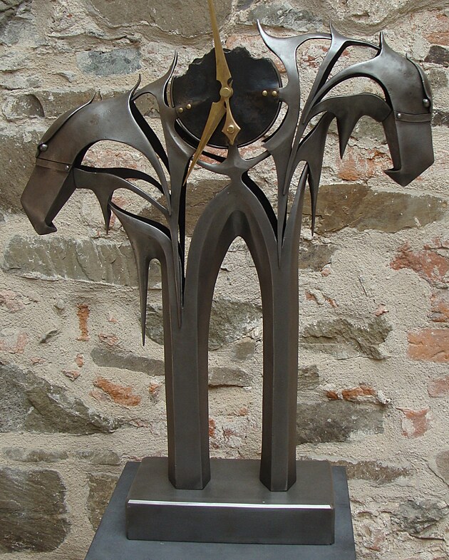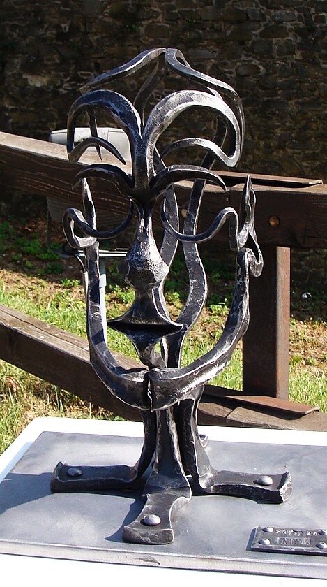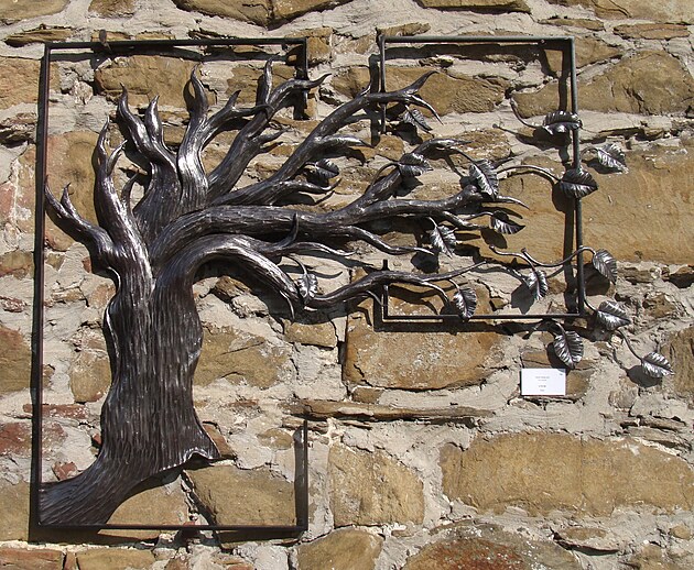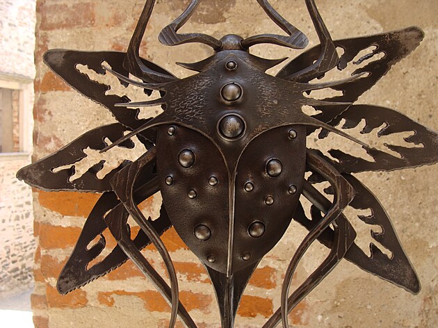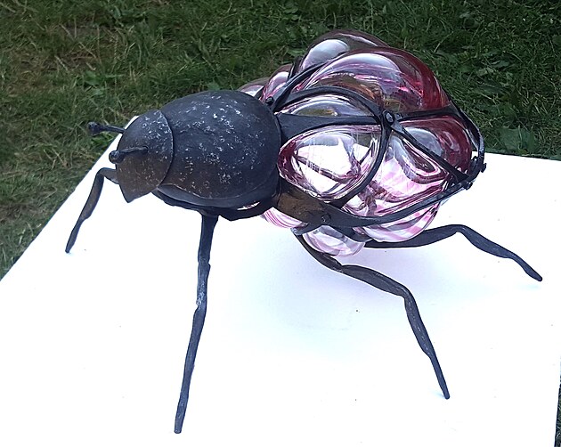 Využití skleněných prvků při tvorbě kované plastiky není sice nic nového, na dalším díle je však vidět, že v tomto případě mistr sklář vyfoukl skleněnou kouli už do hotové plastiky.