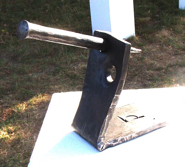 Jedna z mnoha skupin kovářů při práci. Mistr zpravidla drží dílo v kleštích a pomocníci přitloukají.