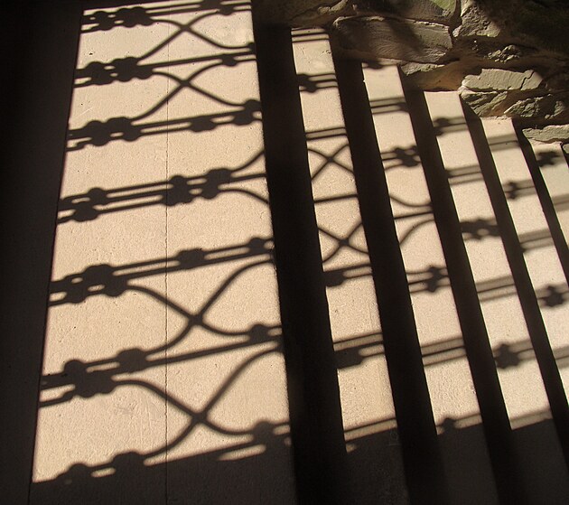 Tady to není žádné umělecké dílo, to jenom na schody dopadá stín ze zamřížovaného okénka.
