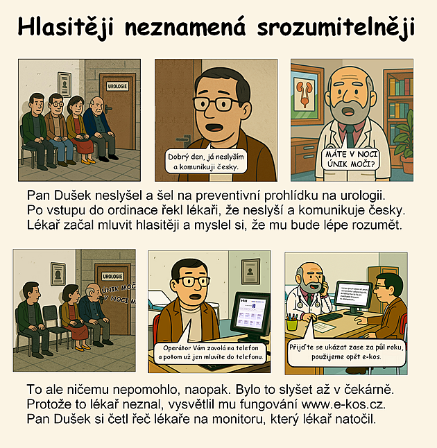• je přesvědčován, že když někdo neslyší, komunikuje ve znakovém jazyce, a pokud mluví, tak dokonce jen „špatně slyší“,