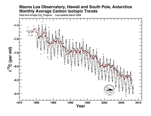 Fosilní paliva (uhlí, ropa, zemní plyn) vznikla z organické hmoty (rostlin), která obsahuje méně izotopu uhlíku 13C než atmosféra. Rostliny totiž při fotosyntéze mírně upřednostňují lehčí izotop 12C před těžším 13C (tzv. izotopová frakcionace). Ve fosilních palivech je tedy mírný deficit 13C. Když se pak fosilní paliva spalují, uvolňuje se do atmosféry CO2, mírně ochuzený o 13C. Tím se poměr izotopů 13C/12C ve vzduchu snižuje a toto snižování bylo i naměřeno: