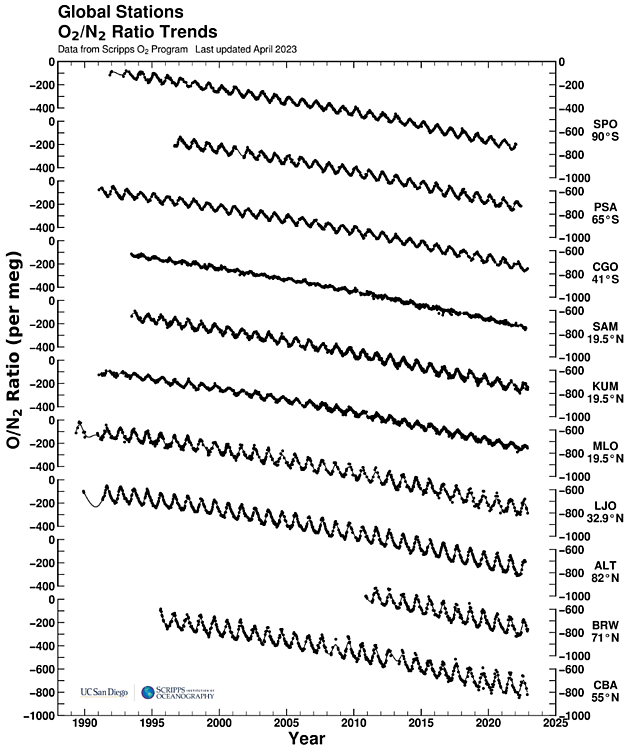 Kdo dával na základní škole pozor při chemii, může teď namítnout „Ale pokud by to bylo způsobeno spalováním fosilních paliv, tak by se při oxidaci uhlíku musel spotřebovávat kyslík“. Přesně tak. Podíl množství kyslíku a dusíku v atmosféře v posledních desetiletích mírně klesá. Je to vidět i na výsledcích měření, dostupných třeba zde.