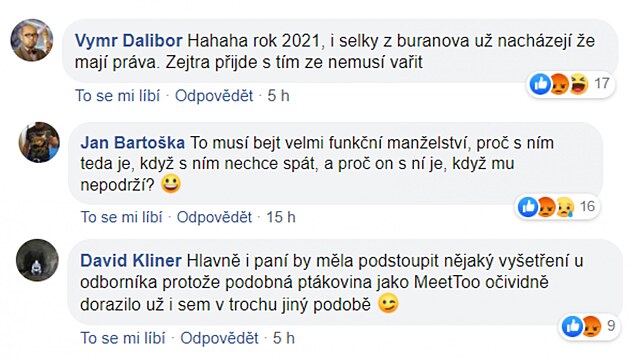 Jsem ráda, že existují muži, kteří jsou pro své ženy milujícími partnery a pro které je výše uvedené chování stejně nepředstavitelné jako pro mě a další hysterické feministky snažící se rozvrátit tradiční rodinu. Nebyla jsem tam a nevím, jak se situace odehrála. Každopádně obrovské (nikoli ojedinělé) množství šokujících komentářů od spousty frustrovaných staromilců a macho borců bez jakýchkoli zábran mě však upřímně vyděsil a utvrdil v tom, že čeští muži se nemusí bát žádných migrantů z východu, protože si své manželky s naprostým klidem znásilní sami, napíší o tom do diskuze a příspěvky si vzájemně olajkují.